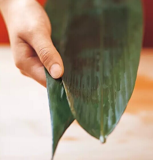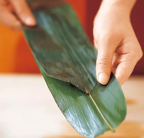 ?取2片粽葉,抹干水分,順向1/3處重疊平放在手心。如果很寬很長(zhǎng)的粽葉,1片也可以。
