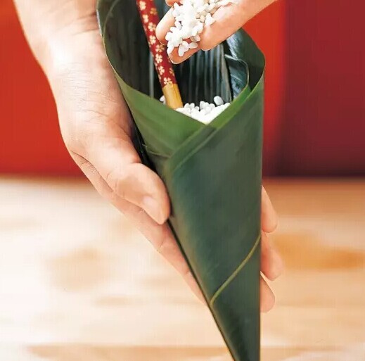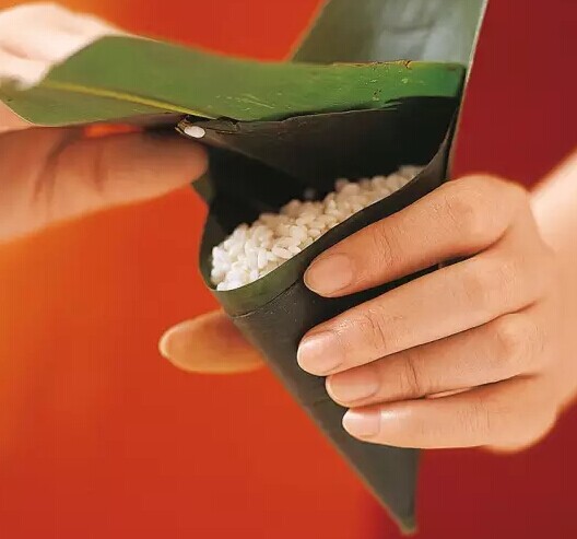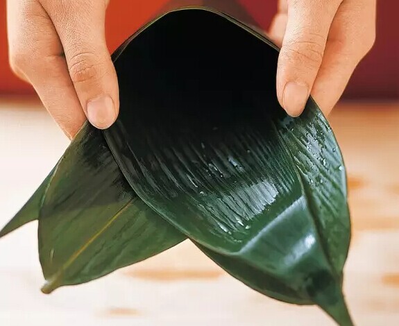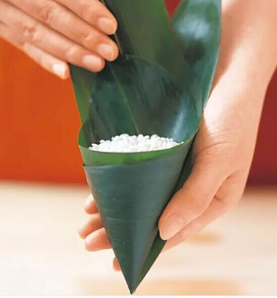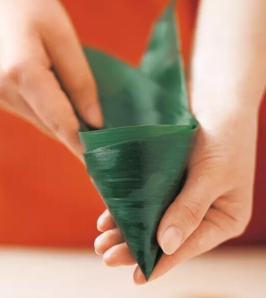 ?雙手捏住粽葉兩端,同時(shí)向內(nèi)交叉重疊,折成漏斗形,然后將內(nèi)側(cè)的粽葉在漏斗內(nèi)旋轉(zhuǎn)1圈,再回到原來(lái)的位置,使漏斗變成圓錐形。