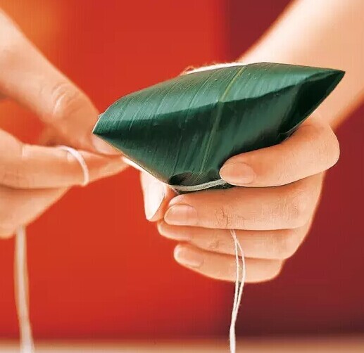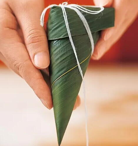 ?用繩子環(huán)繞粽子四面數(shù)圈,將粽子緊緊裹住,并在粽腰處扎緊打結(jié)。(此步驟非常重要,如果繩子捆得不夠結(jié)實(shí),在煮制過(guò)程中粽葉會(huì)有松開的可能,這樣就前功盡棄了)