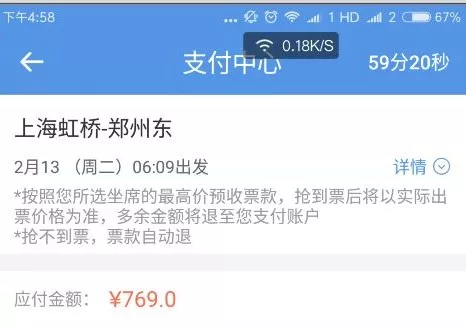 小編在智行APP上查詢了一下上海到鄭州,2月13日的火車票,果然需要搶票,鮮姐就選擇一等座,票價(jià)739元,反正不是真付款,奢侈一把: