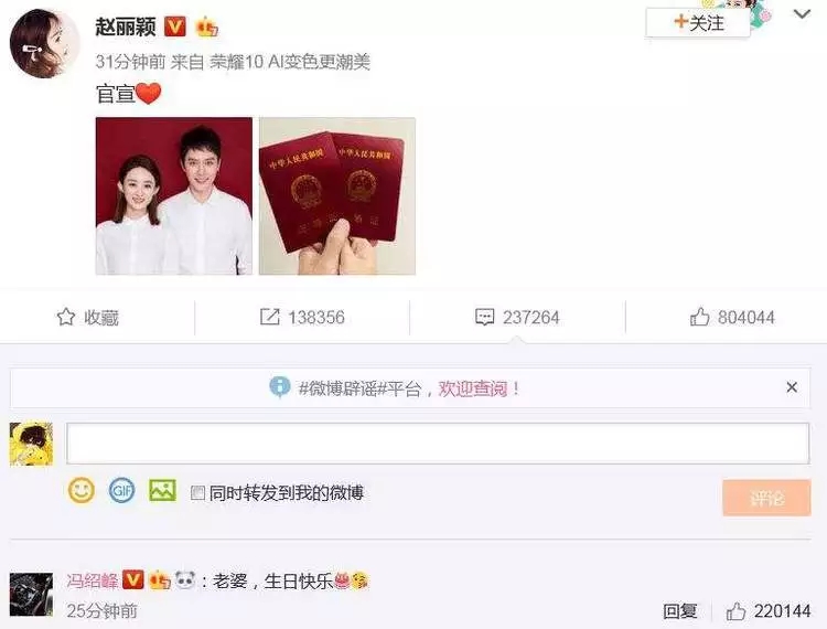 趙麗穎馮紹峰官宣婚訊致微博宕機